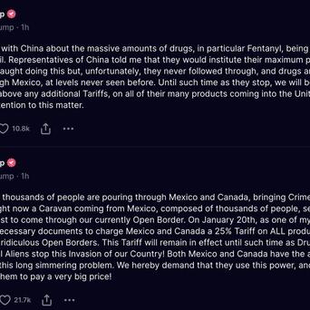 特朗普在Truth Social发帖:“1月20日,手脚我的首批行政号令之一,我将签署统共必要文献,对墨西哥和加拿大统共干涉好意思国的居品征收25%的关税,他们实行造作的怒放边境计谋。”特朗普暗意,关税将捏续施行,直到两国严厉打击毒品(格外是芬太尼)和犯罪逾境外侨。